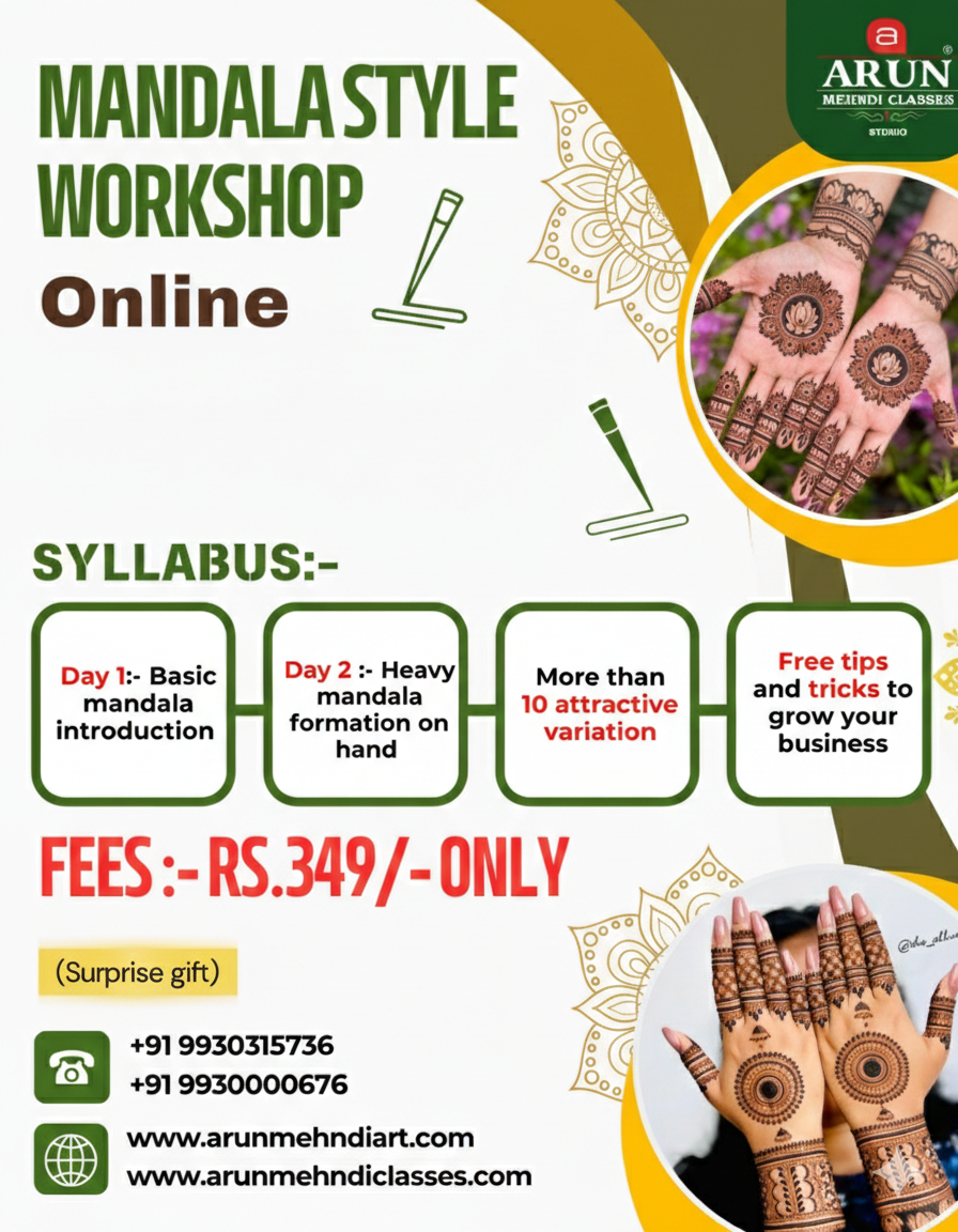 Join our exclusive online workshop and master the art of Mandala Mehndi desAigns from basic to advanced levels! Whether you’re a beginner or an experienced artist, this live interactive session will help you refine your skills with expert guidance